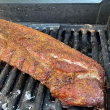 5. After 1.5 - 2 hours in aluminum foil, remove the ribs from the grill and open up the foil. Use the foil as a tray with the meat side up and apply a coating of your wet rub. Place them on your grill (still on the unlit side) without the foil and cook till they feel sticky (about .5 - 1 hour)
